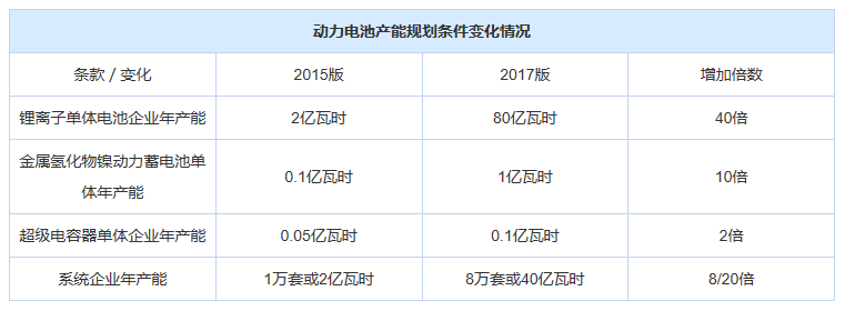 2016年11月,在2015版《汽車動力蓄電池行業(yè)規(guī)范條件》基礎(chǔ)上,工信部組織形成了《汽車動力電池行業(yè)規(guī)范條件(2017年)》(征求意見稿),并公開向全社會征求意見。這也就是所謂的“2.0版”白名單。該版本的最大變化在于,產(chǎn)能要求相比2015年的“1.0”版提高了40倍。