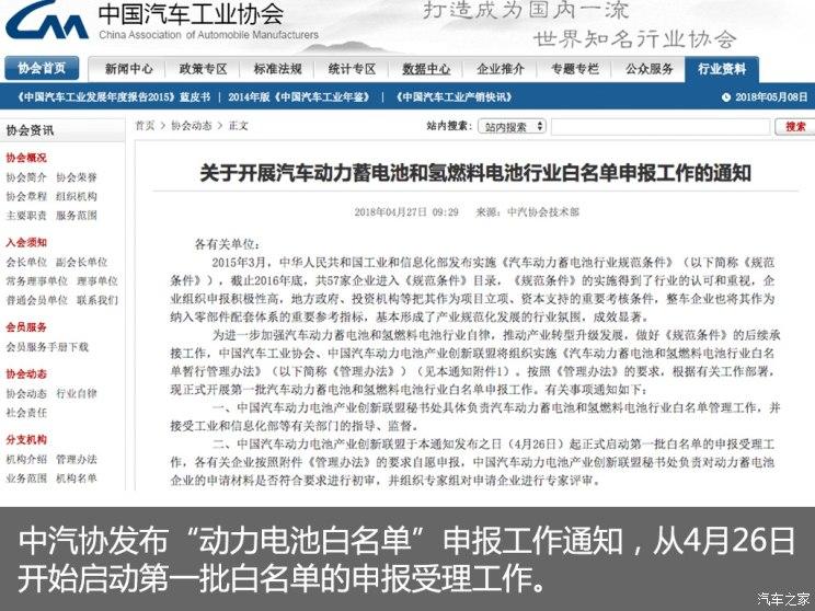 2018年4月27日,中汽協(xié)官方網(wǎng)站發(fā)布了《關(guān)于開展汽車動力蓄電池和氫燃料電池行業(yè)白名單申報(bào)工作的通知》,通知指出:將由中國汽車動力電池產(chǎn)業(yè)創(chuàng)新聯(lián)盟組織實(shí)施《汽車動力蓄電池和氫燃料電池行業(yè)白名單暫行管理辦法》,并接受工信部等有關(guān)部門的指導(dǎo)、監(jiān)督。