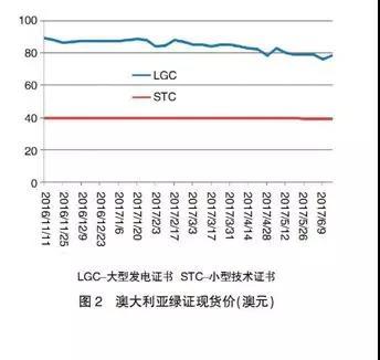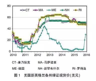 各國綠證交易價格主要受證書供需形勢影響,同時也與可再生能源發(fā)電技術(shù)類型、季節(jié)波動、監(jiān)管懲罰強度等多種因素相關(guān),具有較大的差異性和波動性。從美國新英格蘭地區(qū)各州的綠證現(xiàn)貨價格來看,馬薩諸塞、羅得島、康乃狄克和新罕布什爾州的綠證供應(yīng)在2013~2015年期間供應(yīng)偏緊,單位綠證的交易價格達50~60美元,而同期的緬因州由于生物質(zhì)發(fā)電計入綠證核發(fā)范圍、綠證供應(yīng)顯著高于需求,價格降至10美元以下。澳大利亞大型發(fā)電技術(shù)證書價格因供應(yīng)增加,自2016年下半年以來震蕩下行,但截至2017年6月仍高于75澳元;小型技術(shù)證書則主要受限價、罰款等因素影響,一直保持在最高限定價格40澳元附近。此外,從部分國家和地區(qū)的交易市場來看,風(fēng)電由于成本和價格較低在早期時是綠證交易主體,太陽能發(fā)電由于價格快速下降、有取代風(fēng)電成為交易主體的趨勢(見圖1、圖2)。