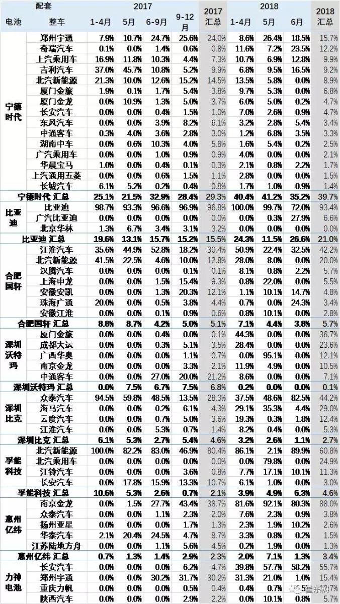從18年1-6月的數(shù)據(jù)來看電池廠家的整車配套有明顯的變化,尤其是以寧德時代為代表,目前的配套總體是乘車,尤其是以北汽能源,奇瑞汽車和長安汽車為代表,著力開發(fā)了長安和奇瑞兩大企業(yè)。而與鄭州宇通等客車企業(yè)的占比大幅下降。
