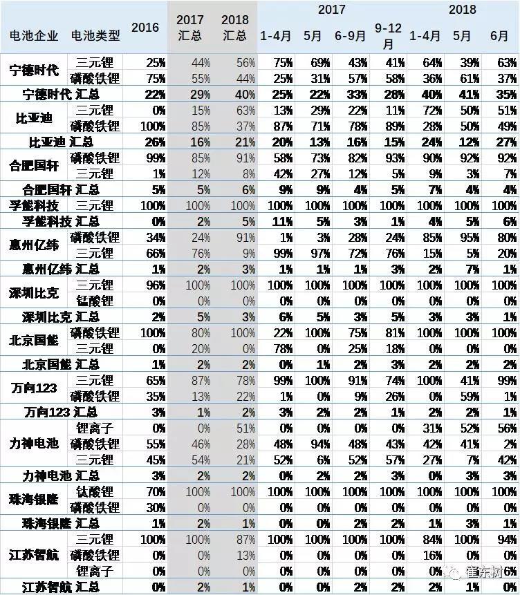 主力廠家優(yōu)勢相對明顯,寧德時代的三元里的產(chǎn)量占比在快速提升中。尤其是寧德時代為代表2018年1-4月的三元鋰占比自身總量達(dá)到64%,5月達(dá)到自身39%比例,6月回升到63%。