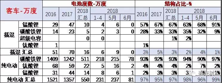 客車電池以磷酸鐵鋰為主,但占比不高,錳酸鋰、超級電容的產(chǎn)比也有一定的市場空間。18年6月的磷酸鐵鋰客車電池需求表現(xiàn)較好,達(dá)到97%。
