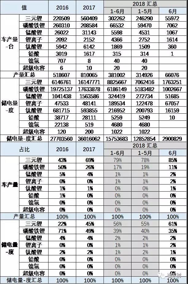 2018年1-6月的三元電池占比達(dá)到56%,要17年的45%提升11個百分點,17年較16年的22%也提升了20個百分點。而錳酸鋰和鈦酸鋰的需求逐步減弱。但6月的磷酸鐵鋰到61%,也是合理回歸。