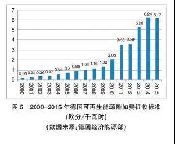 英、德的可再生能源補貼所需資金,均主要通過終端用戶電價上加征可再生能源附加(EEG)的方式獲取。從2000年到2014年,德國的可再生能源附加(EEG)征收標(biāo)準(zhǔn)逐年上調(diào),從0.19歐分/千瓦時增加到6.24歐分/千瓦時,2015年比2014年略有下降,為6.17歐分/千瓦時。2015年,可再生能源附加(EEG)占居民電費比例為21.2%(其余支出項目為:發(fā)電26%,輸、配、售22.7%,增值稅16%,特許經(jīng)營費5.6%,其他附加費1.7%,見圖5)。英國居民電費中用于低碳能源支持的資金約占10%左右。
