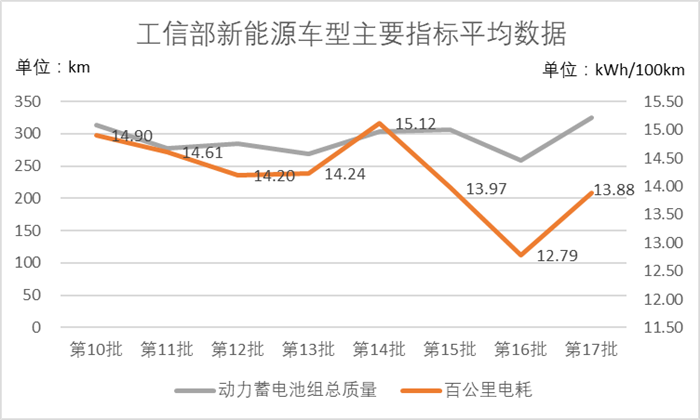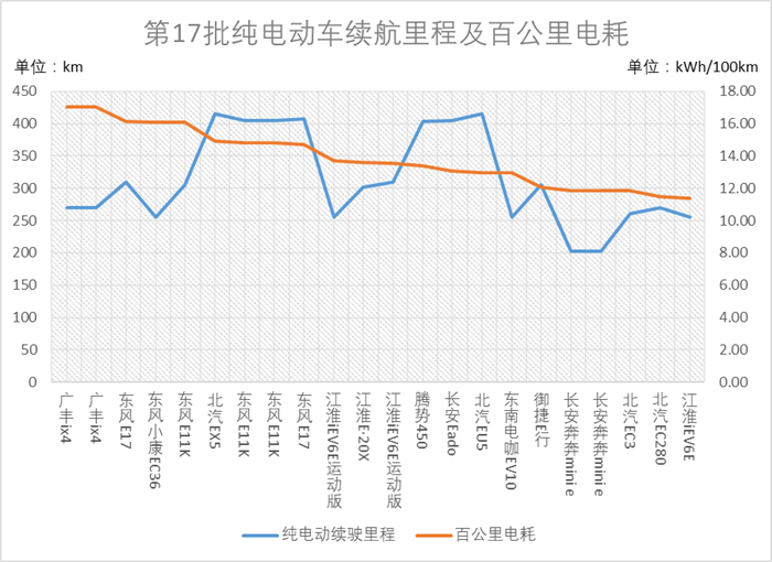 在第17批新能源車型中,百公里電耗最低的車型為江淮iEV6E,達(dá)到了11.37kWh/100km,而表現(xiàn)最差的是廣汽豐田的ix4,百公里電耗高達(dá)17.04kWh/100km。