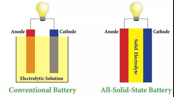 左側(cè)為傳統(tǒng)液態(tài)電池,右側(cè)為全固態(tài)電池