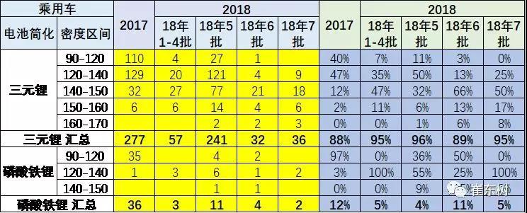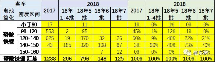 以上為純電動且非快充的電池的特征。18年純電乘用車的能量密度的提升也是較快,但18年第7批乘用車車高于120的占到100%,140-150瓦的純電三元電池的達到50%。