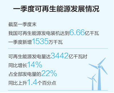 同時(shí),可再生能源利用水平顯著提升。一季度可再生能源發(fā)電量達(dá)3442億千瓦時(shí),同比增長(zhǎng)14%;可再生能源發(fā)電量占全部發(fā)電量的22%,同比上升1.4個(gè)百分點(diǎn)?!叭龡墶眴?wèn)題有效緩解:全國(guó)基本無(wú)棄水;棄風(fēng)電量91億千瓦時(shí),棄風(fēng)率8.5%,同比下降8個(gè)百分點(diǎn);棄光電量16.2億千瓦時(shí),棄光率4.3%,同比下降5.4個(gè)百分點(diǎn)。