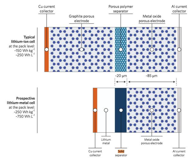 根據(jù)Nature的文章,金屬鋰電極可以使鋰電池的能量提高35%,能量密度提高50%。這可能會(huì)讓一個(gè)電池可以提供350或400瓦時(shí)每千克或1000瓦時(shí)每升的電能。