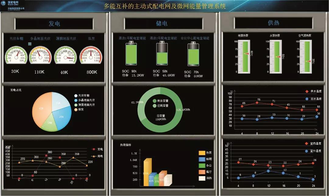 多能互補(bǔ)主動(dòng)配電網(wǎng)充分發(fā)揮電網(wǎng)的能源供給的基礎(chǔ)配置作用,實(shí)現(xiàn)了多種能源輸入(太陽(yáng)能、天然氣、淺層地?zé)崮艿龋?、多種供能方式的輸出(冷、熱、電等)、多種能源轉(zhuǎn)換單元(光伏、燃?xì)廨啓C(jī)、內(nèi)燃機(jī),儲(chǔ)能系統(tǒng)等),將配電網(wǎng)由原來(lái)單一電能分配的角色轉(zhuǎn)變?yōu)榧娔苁占?、電能傳輸、電能存?chǔ)分配、冷熱的轉(zhuǎn)化和傳輸為一體的新型多能源網(wǎng)絡(luò)系統(tǒng),即可充分利用可再生能源,同時(shí)又保證系統(tǒng)的電能質(zhì)量、運(yùn)行穩(wěn)定性、供電可靠性以及區(qū)域冷熱的綜合供應(yīng),技術(shù)驗(yàn)證,具有示范推廣價(jià)值。