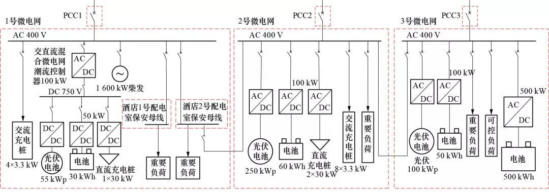并網(wǎng)運(yùn)行時(shí),綜合優(yōu)化分布式光伏、分布式儲(chǔ)能、集中式儲(chǔ)能及電動(dòng)汽車,提高分布式電源的利用率,驗(yàn)證3個(gè)不同類型微電網(wǎng)的平滑功率控制、聯(lián)合優(yōu)化控制以及需求側(cè)響應(yīng)等能量管理策略;通過(guò)集中儲(chǔ)能降低配電網(wǎng)功率波動(dòng)并進(jìn)行削峰填谷控制,并根據(jù)酒店、會(huì)議中心和電動(dòng)汽車的用電特性,綜合考慮冷、熱及電需求供應(yīng),設(shè)計(jì)燃油發(fā)電、光伏發(fā)電及水蓄熱等等互補(bǔ)調(diào)峰策略,實(shí)現(xiàn)區(qū)域內(nèi)多種能源的安全穩(wěn)定供應(yīng)及經(jīng)濟(jì)高效運(yùn)行。當(dāng)911/912某一供電線路停電時(shí)導(dǎo)致單個(gè)微電網(wǎng)上級(jí)電網(wǎng)失電時(shí)通過(guò)負(fù)荷轉(zhuǎn)移恢復(fù)微電網(wǎng)供電。