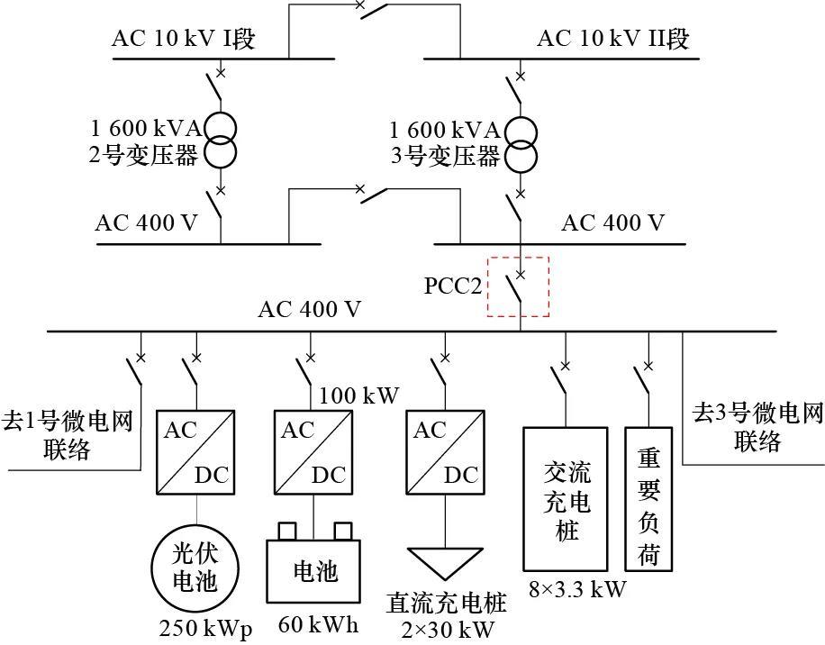 2號(hào)微電網(wǎng)包括光伏發(fā)電、儲(chǔ)能、充電樁及負(fù)荷,重點(diǎn)驗(yàn)證高滲透率分布式光伏接入的穩(wěn)定控制。2號(hào)微電網(wǎng)接線如圖6所示,2號(hào)微電網(wǎng)通過(guò)PCC2并網(wǎng),光伏發(fā)電250?kW,儲(chǔ)能60?kWh,儲(chǔ)能變流器100?kW,2臺(tái)30?kW直流充電樁,8臺(tái)7?kW交流充電樁。