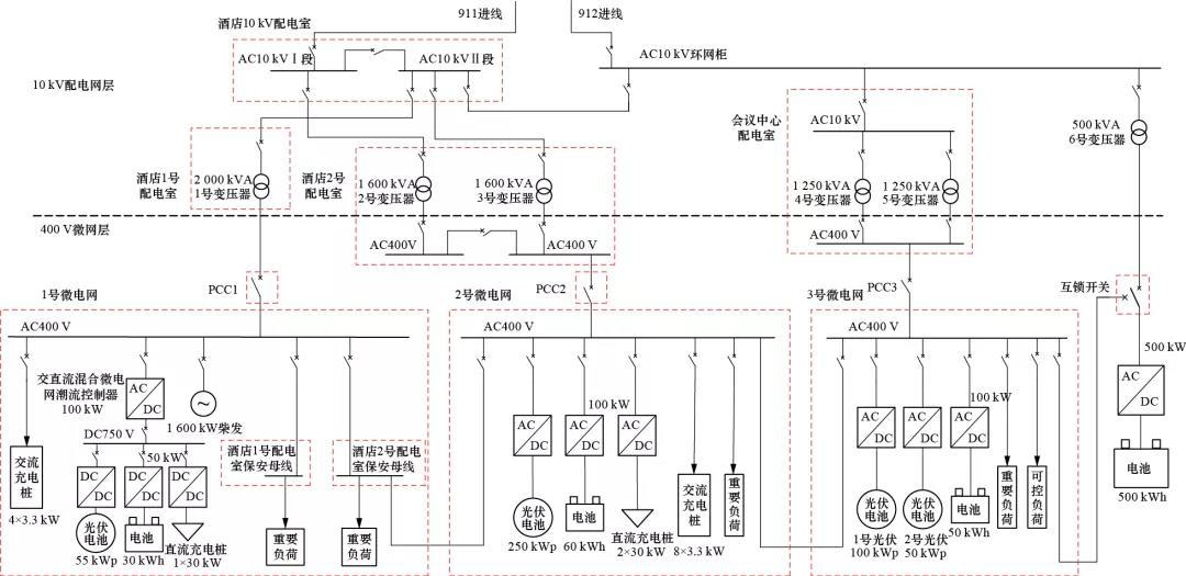億利多能互補(bǔ)主動(dòng)配電網(wǎng)結(jié)構(gòu)示意如圖3所示,由911和912兩條外部供電線路,供電范圍設(shè)計(jì)設(shè)計(jì)了1號(hào)、2號(hào)、3號(hào)微電網(wǎng),分別實(shí)踐交直流混合供電、接納高滲透率的分布式發(fā)電、保證重要負(fù)荷的無(wú)縫供電等功能;集中儲(chǔ)能接入10?kV配電網(wǎng),并網(wǎng)運(yùn)行時(shí)作為柔性負(fù)荷降低配電網(wǎng)功率波動(dòng)、削峰填谷、經(jīng)濟(jì)優(yōu)化調(diào)度等,離網(wǎng)時(shí)作為3號(hào)微電網(wǎng)的備用電源延長(zhǎng)離網(wǎng)供電時(shí)間。另外,根據(jù)酒店、會(huì)議中心和電動(dòng)汽車的用電特性,綜合考慮冷、熱及電需求供應(yīng),設(shè)計(jì)燃油發(fā)電、光伏發(fā)電及水蓄熱等互補(bǔ)調(diào)峰策略,實(shí)現(xiàn)區(qū)域內(nèi)多種能源的安全穩(wěn)定供應(yīng)及經(jīng)濟(jì)高效運(yùn)行等目標(biāo)。