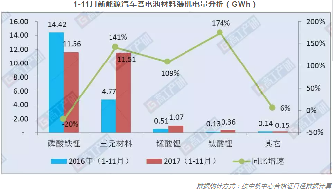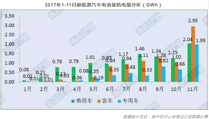 高工產(chǎn)業(yè)研究院(GGII)數(shù)據(jù)統(tǒng)計(jì)顯示,2017年11月新能源汽車動(dòng)力電池裝機(jī)總電量約6.98GWh,同比增長(zhǎng)20%,環(huán)比增長(zhǎng)138%。1-11月動(dòng)力電池裝機(jī)總電量約24.65GWh,同比增長(zhǎng)23%。