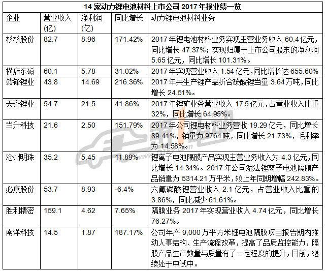 近日,鋰電池材料上市公司2017年報(bào)陸續(xù)發(fā)布。第一電動網(wǎng)不完全統(tǒng)計(jì)了杉杉股份、贛鋒鋰業(yè)、橫店東磁、天齊鋰業(yè)、當(dāng)升科技、滄州明珠等14家鋰電池材料上市公司2017年報(bào)。受新能源汽車發(fā)展影響,鋰電池材料上市企業(yè)2017年業(yè)績亮眼。