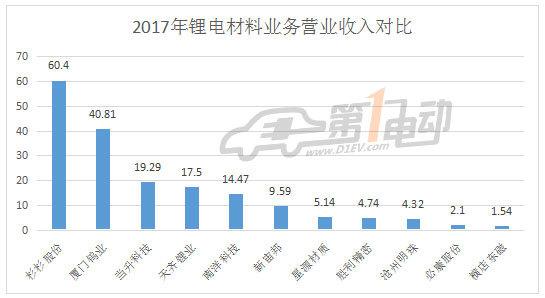動力鋰電池材料業(yè)務(wù)方面,2017年,杉杉股份鋰電池材料業(yè)務(wù)實(shí)現(xiàn)主營業(yè)務(wù)收入60.4億元,同比增長47.37%。廈門鎢業(yè)電池材料營收40.81億元,同比增長99.02%,占總營收比重達(dá)28.76%。當(dāng)升科技鋰電材料業(yè)務(wù)營收19.29億元,同比增長89.41%,銷量為9764噸,同比增長21.73%。滄州明珠鋰離子電池隔膜產(chǎn)品實(shí)現(xiàn)主營業(yè)務(wù)收入為4.3億元,同比增長14.34%。勝利精密隔膜業(yè)務(wù)2017年實(shí)現(xiàn)營業(yè)收入4.74億元,同比增長76.27%。