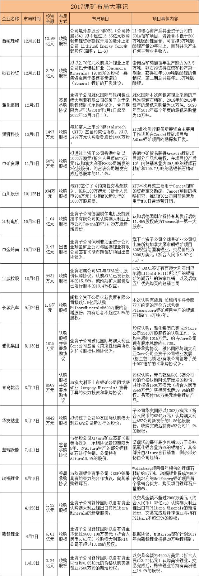 以下為中國企業(yè)2017年海外布局鋰礦項目: