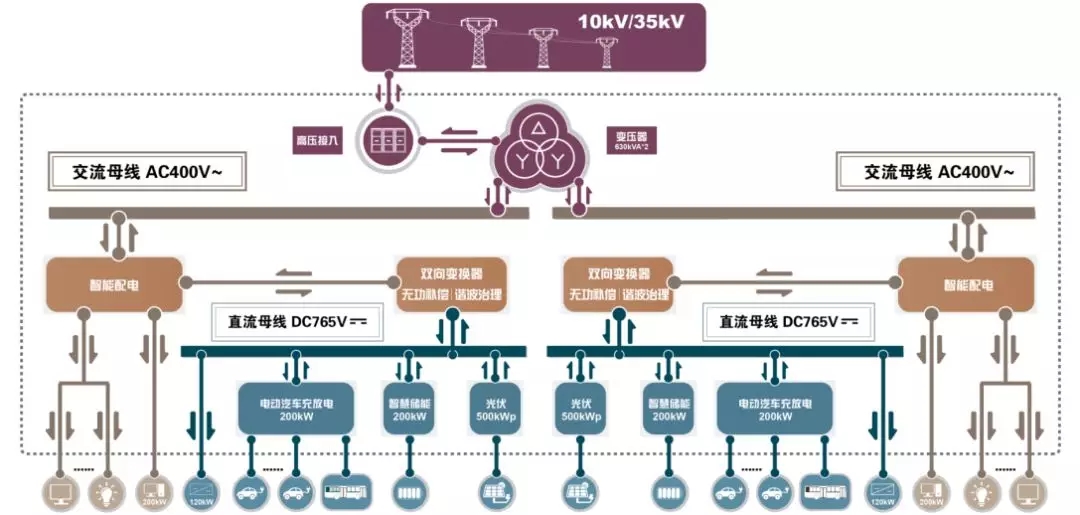 我們把配電、光伏、儲能、充電等電力電子設(shè)備高度集成,做到一個箱變里面,外面接10kv,配交流和直流兩條母線,交流的負載做到交流母線上,直流的負載做在直流母線上,這樣一個箱變就解決了四個箱變的問題,用一個箱變的投資代替四個箱變的投資,設(shè)備的綜合投資包括占地面積、集約程度都會有一個很大的進步,就會形成一個高度集成的系統(tǒng)。