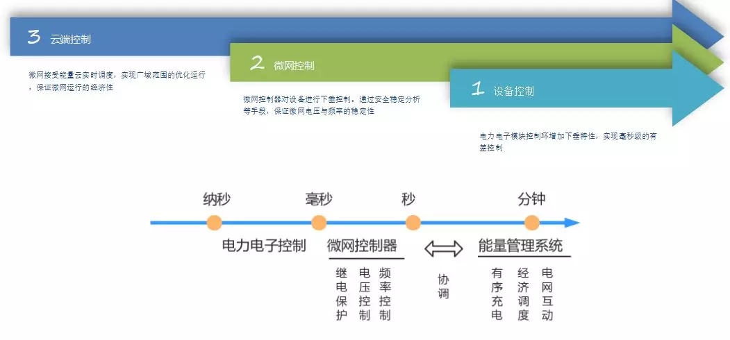 基于就地控制和云端控制等多個層級的控制來實現(xiàn)微網(wǎng)。就地控制可以實現(xiàn)毫秒級的管控,例如大電網(wǎng)跳電、并離網(wǎng)切換、或者云層遮擋了光伏,光伏出力減少等情況,就可以實現(xiàn)設(shè)備的就地切換,通過能量管理系統(tǒng)做分鐘級或者小時級的能量負荷預(yù)測,充放電、經(jīng)濟的調(diào)度、通過云端控制。