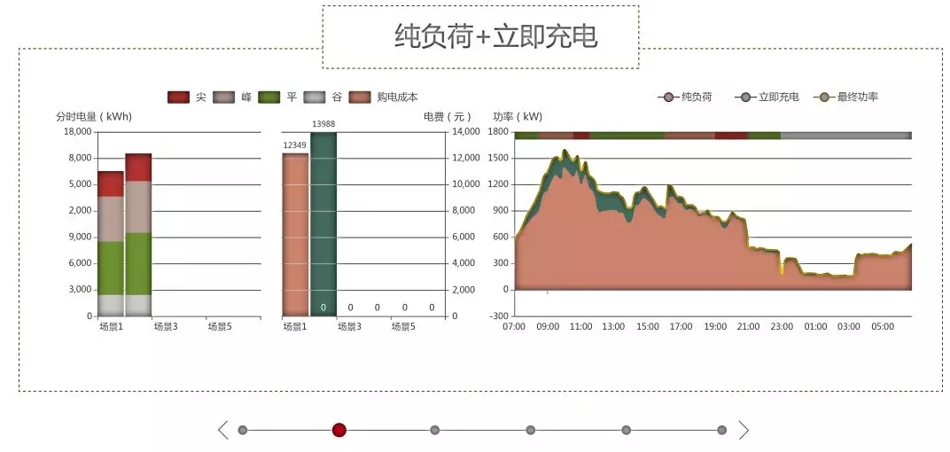 上圖是園區(qū)最初的用電情況。左邊是用電負荷,中間是電費情況,綠色的圓柱代表的是廠區(qū)的純負荷,加上引進電動車之后的無序充電,從右側(cè)的圖中可以看到,上午的時候峰值很高,夜晚谷電的時候基本上無人使用,這也是大部分園區(qū)目前的用電情況。