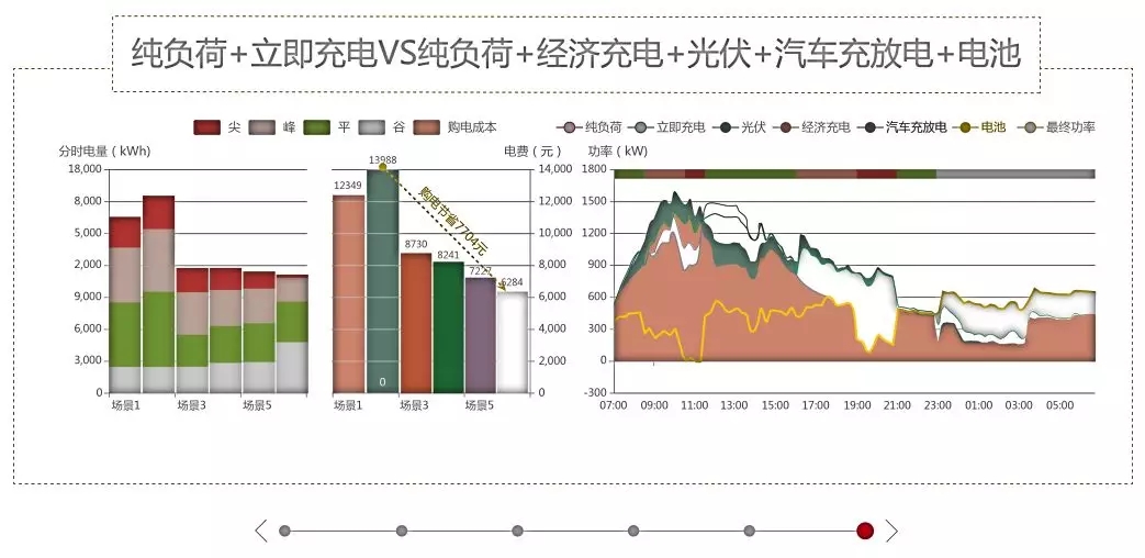 根據(jù)上述情況,我們把光伏引進到微網(wǎng)中,園區(qū)的電費直接降到了8730元;把車有序的充放電、儲能電池引進之后,從右側(cè)的負荷情況中可以看到低谷時期的負荷比以前高了很多,尖峰的時候比以前低了很多,全天的負荷比較平滑,電費也達到了50%左右的節(jié)能開支,可以說在微網(wǎng)的應(yīng)用上取得了一定的成功。