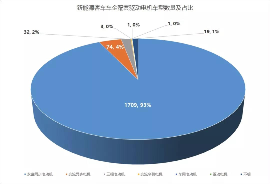 據(jù)統(tǒng)計(jì),絕大多數(shù)車企選擇配套永磁同步電機(jī)。其中113家車企的1709個(gè)車型配套永磁同步電機(jī),占比高達(dá)93%;17家車企的74個(gè)車型配套交流異步電機(jī);10家車企的32個(gè)車型配套三相電動(dòng)機(jī);2家車企的3個(gè)車型配套交流牽引電機(jī);1家車企(金華青年汽車)的1個(gè)車型配套車用電機(jī);1家車企(南京金龍客車)的1個(gè)車型配套驅(qū)動(dòng)電機(jī);另外有9家車企的19個(gè)車型配套電機(jī)不明。