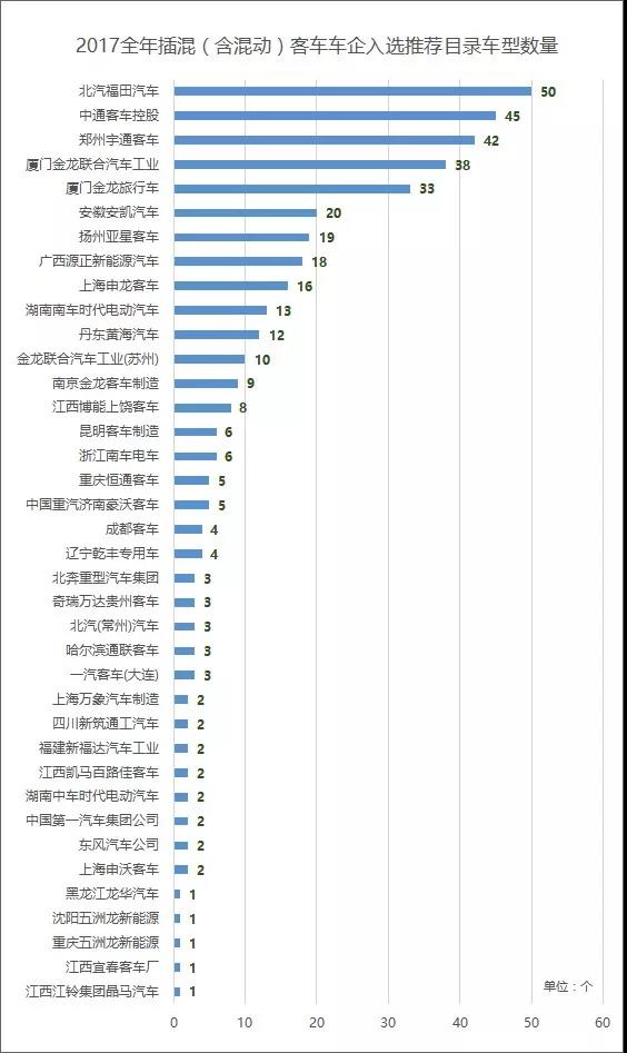 2017全年,共計(jì)38家車企的399個(gè)車型(含混合動(dòng)力車型86個(gè))進(jìn)入新能源客車推薦目錄,北汽福田進(jìn)入車型數(shù)量最多,達(dá)到50個(gè);中通客車進(jìn)入45個(gè);鄭州宇通進(jìn)入42個(gè);廈門金龍聯(lián)合汽車工業(yè)進(jìn)入38個(gè);廈門金龍旅行車進(jìn)入33個(gè),各車企車型進(jìn)入數(shù)量如下圖所示。