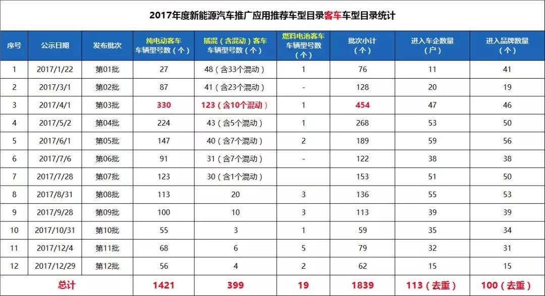 2017全年共計(jì)113家車企的1839個(gè)車型進(jìn)入的新能源客車推薦目錄,其中純電動(dòng)客車1421個(gè)車型,占比77.3%;插電式混合動(dòng)力客車399個(gè)車型(包括86個(gè)混合動(dòng)力客車車型),占比21.7%;燃料電池客車19個(gè)車型,占比1.0%。詳情如下表所示。