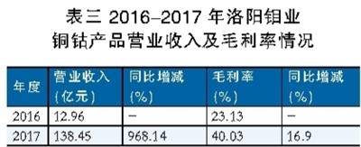2017年,得益于鈷產(chǎn)量的大幅提升(見(jiàn)表二)及其價(jià)格高企,鈷產(chǎn)品成為了洛陽(yáng)鉬業(yè)的主要收入來(lái)源。2017 年,洛陽(yáng)鉬業(yè)實(shí)現(xiàn)營(yíng)業(yè)務(wù)收入 241.48億元元,同比增長(zhǎng)247.47%,其中,銅鈷相關(guān)產(chǎn)品的營(yíng)業(yè)收入達(dá)138.45億元,占57.33%,同比增加38.69個(gè)百分點(diǎn);主營(yíng)業(yè)務(wù)實(shí)現(xiàn)毛利潤(rùn)89.05億元,其中,銅鈷產(chǎn)品的毛利潤(rùn)達(dá)55.42億元,占62.23%(見(jiàn)表三);實(shí)現(xiàn)歸屬上市公司股東的凈利潤(rùn)為27.28億元,同比增長(zhǎng)173.32%。由此可見(jiàn),鈷產(chǎn)品已經(jīng)成為洛陽(yáng)鉬業(yè)的主要收入和利潤(rùn)來(lái)源,其對(duì)洛陽(yáng)鉬業(yè)的營(yíng)業(yè)收入和利潤(rùn)都有重大的影響。
