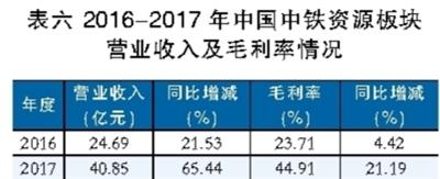 近年來(lái),中國(guó)中鐵一直力推多元化經(jīng)營(yíng),也取得了不斐成績(jī)。2017年,中國(guó)中鐵的礦產(chǎn)資源板塊實(shí)現(xiàn)收入 40.85 億元,同比增長(zhǎng) 65.44%;毛利率為 44.91%,同比增加 21.19 個(gè)百分點(diǎn)(見(jiàn)表六)。