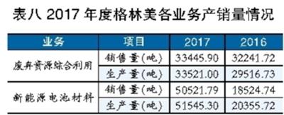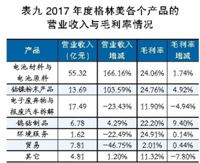 2017年度,格林美鈷相關(guān)產(chǎn)品的產(chǎn)銷(xiāo)量大增 (見(jiàn)表八),因此,其業(yè)績(jī)也十分亮眼。其實(shí)現(xiàn)營(yíng)業(yè)收入107.52億元,增長(zhǎng)37.22%;利潤(rùn)總額7.95億元,增長(zhǎng)123.47%;歸屬于上市公司股東凈利潤(rùn)6.1億元,增長(zhǎng)131.42%。其中,電池材料與電池原料業(yè)務(wù)板塊(主要是硫酸鎳、硫酸鈷、四氧化三鈷、三元前驅(qū)體、三元正極材料、鈷酸鋰等)實(shí)現(xiàn)營(yíng)業(yè)收入為55.32億元,增長(zhǎng)166.16%,貢獻(xiàn)毛利額13.31億元(見(jiàn)表九);鈷鎳鎢粉末與硬質(zhì)合金產(chǎn)品業(yè)務(wù)板塊實(shí)現(xiàn)營(yíng)業(yè)收入20.48億元,增長(zhǎng)54.76%,貢獻(xiàn)毛利額4.9億元;可見(jiàn),鈷相關(guān)產(chǎn)品回收與再利用已經(jīng)是格林美營(yíng)收和利潤(rùn)的主要來(lái)源。