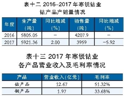 鈷產(chǎn)品在寒銳鈷業(yè)的收入構(gòu)成中占比越來(lái)越重(見(jiàn)圖二),再綜合其產(chǎn)品毛利率來(lái)看(見(jiàn)表十三),鈷產(chǎn)品是其收入和利潤(rùn)的核心來(lái)源。故而,寒銳鈷業(yè)也在加碼鈷產(chǎn)品產(chǎn)能。2017年,其年產(chǎn)3000噸金屬量鈷粉生產(chǎn)線和技術(shù)中心建設(shè)項(xiàng)目按計(jì)劃順利推進(jìn),剛果邁特礦業(yè)有限公司建設(shè)年產(chǎn)5000噸電解鈷生產(chǎn)線項(xiàng)目,已完成前端5000噸金屬量氫氧化鈷生產(chǎn)線,并已經(jīng)投產(chǎn)發(fā)揮效益;寒銳鈷業(yè)在科盧韋齊投資建設(shè)2萬(wàn)噸電積銅和5000噸氫氧化鈷項(xiàng)目也按計(jì)劃推進(jìn)中。這些項(xiàng)目完成后,其鈷產(chǎn)能將大幅增加。