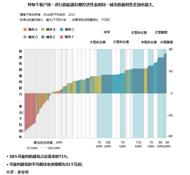 一些客戶需要為高峰時(shí)段使用電力付費(fèi)(需量電費(fèi))。能源存儲(chǔ)可以用于降低最高耗量(客戶從電網(wǎng)中使用的最大電力),以此減少客戶的需量電費(fèi)。據(jù)麥肯錫計(jì)算,北美大多數(shù)客戶需量電費(fèi)的收支平衡點(diǎn)是9美元/千瓦。麥肯錫預(yù)計(jì),到2020年該費(fèi)用可減低至4或5美元/千瓦。重要的是,即使服務(wù)同一地理區(qū)域內(nèi)潛在能源存儲(chǔ)客戶并繳納相同稅收,盈利能力也不盡相同,主要原因是客戶特有的活動(dòng)不同。另一個(gè)有趣的情況是,隨著存儲(chǔ)成本的下降,不僅服務(wù)更多客戶有了經(jīng)濟(jì)性依據(jù),現(xiàn)有客戶存儲(chǔ)的最佳規(guī)模也相應(yīng)增加。