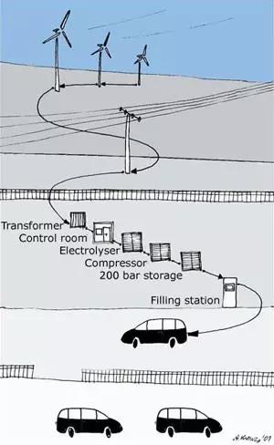 可再生能源如光伏、風電場、海洋能等生產的電力是間歇性的、不穩(wěn)定的,而且多數(shù)在電力需求小的邊遠地區(qū)。如果能夠聯(lián)網(wǎng)直接供給消費地如沿海地區(qū),問題就簡單了,當其再生電力無法使用,于是產生“棄風限電”這種現(xiàn)象。圖2表示風電場產生的電力過剩,采用電解水產生氫,然后注入燃料電池汽車。電解生產的氫經由壓縮機儲存在200 bar(1 bar=0.98692標準氣壓)的儲罐里,以便供應給燃料電池汽車。