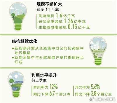 結(jié)構(gòu)繼續(xù)優(yōu)化。一方面,新能源開發(fā)正從資源集中地區(qū)向負(fù)荷集中地區(qū)推進(jìn)?!澳壳罢凑占虚_發(fā)與分散開發(fā)并舉、遠(yuǎn)距離外送與就近消納并重的原則優(yōu)化布局。以光伏為例,今年新增裝機西北地區(qū)占比下降了17個百分點,華東、華中地區(qū)占比分別提升9個百分點、6個百分點?!眹夷茉淳中履茉春涂稍偕茉此靖彼鹃L李創(chuàng)軍告訴記者。另一方面,新能源集中與分散發(fā)展并舉的格局正逐步形成?!胺植际桨l(fā)電具有電力損耗小、輸電費用低、土地和空間資源占用少的優(yōu)點,今年前11月,分布式光伏裝機1723萬千瓦,同比增長了3.7倍?!?