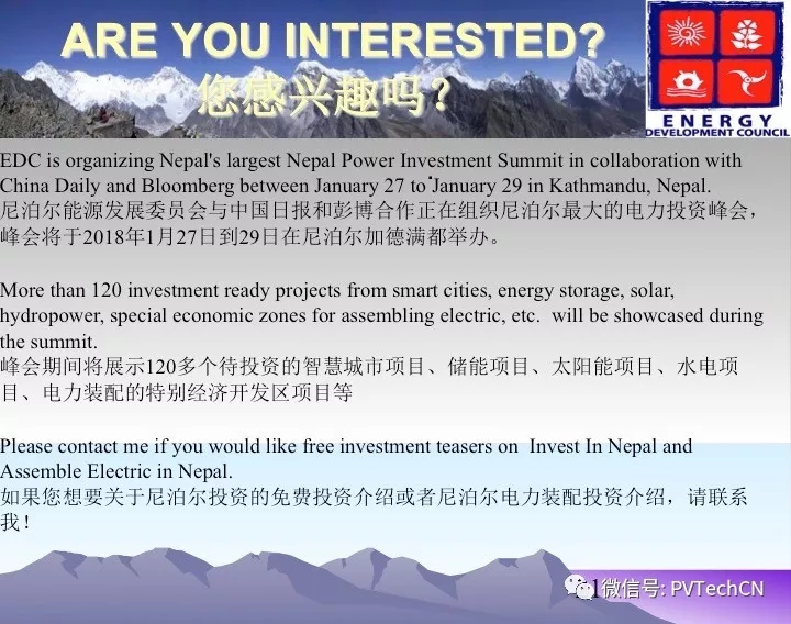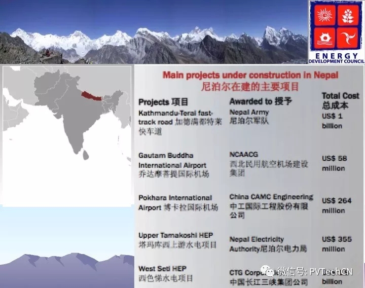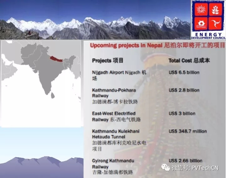 據(jù)悉,尼泊爾即將開工的項(xiàng)目包括:50-100MW電池儲(chǔ)能工廠、800MW交流太陽(yáng)能電站、先進(jìn)規(guī)劃階段的已分配的20MW微電網(wǎng)項(xiàng)目。