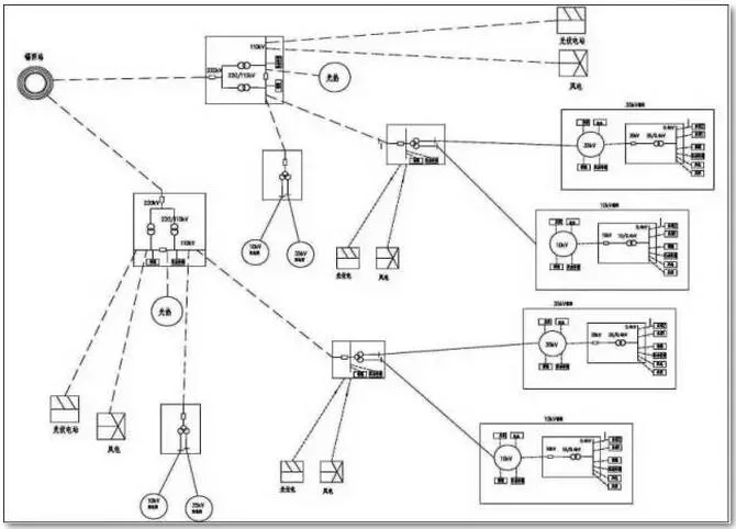 區(qū)域集群式微網(wǎng)采用多級微電網(wǎng)輻射式架構(gòu)。區(qū)域集群式微網(wǎng)總體架構(gòu)如圖所示:接入系統(tǒng)的變電站(220kV),接入新能源電源、儲能和負(fù)荷構(gòu)成主微電網(wǎng);負(fù)荷中心的變電站(110kV)就地接入新能源電源、儲能和負(fù)荷構(gòu)成一級子微電網(wǎng);開發(fā)區(qū)等負(fù)荷區(qū)(35kV或10kV)接入分布式電源、儲能和負(fù)荷構(gòu)成二級子微網(wǎng);終端用戶接入分布式電源、儲能和負(fù)荷構(gòu)成三級子微網(wǎng)。