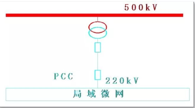 各集群微網(wǎng)通過220kV聯(lián)絡(luò)線實現(xiàn)環(huán)網(wǎng)連接,并通過220kV線路接入到500kV變電站220kV側(cè),在500kV變電站設(shè)置1臺聯(lián)絡(luò)變壓器,實現(xiàn)整個微網(wǎng)的接入。通過500kV與公共電網(wǎng)聯(lián)接。