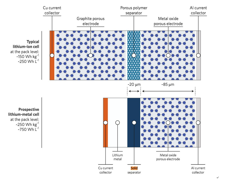 根據(jù)《自然》雜志發(fā)布的文章,鋰金屬電極可以使鋰電池的比能量提高35%,能量密度提高50%。這可能會讓一個電池可以達到每千克350或400瓦時或每升1000瓦時的比能量。