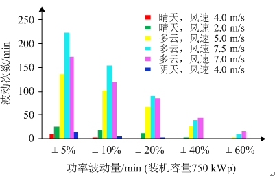 從圖2的統(tǒng)計(jì)結(jié)果看出:功率波動(dòng)幅值主要集中在光伏裝機(jī)容量的±5%~±40%范圍內(nèi),超過(guò)±60%范圍的功率波動(dòng)次數(shù)較少;多云天氣下,功率波動(dòng)更頻繁,主要是由于云移動(dòng)過(guò)程中頻繁地遮擋太陽(yáng)造成;晴天和陰天下功率波動(dòng)次數(shù)很少,幅值也很低,主要因?yàn)榍缣煸粕?對(duì)太陽(yáng)的遮擋較少,而陰天光伏本身出力就低,使得功率的可波動(dòng)范圍相應(yīng)地被縮小。