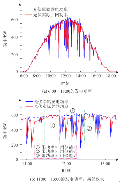系統(tǒng)控制響應(yīng)速度分析:EMS從數(shù)據(jù)采集(≤200 ms),到控制指令計(jì)算(≤500 ms),再到控制指令下發(fā)(≤50 ms),這個(gè)過(guò)程大約耗時(shí)1 s。然后,儲(chǔ)能PCS能夠根據(jù)指令立即調(diào)整充放電功率,認(rèn)為其響應(yīng)時(shí)間≤1 s;同時(shí),光伏PCS調(diào)整MPPT工作點(diǎn),文獻(xiàn)[16]通過(guò)實(shí)驗(yàn)對(duì)光伏MPPT算法追蹤最大功率點(diǎn)的耗時(shí)進(jìn)行了測(cè)算,實(shí)驗(yàn)數(shù)據(jù)表明追蹤耗時(shí)的平均值為0.44 s。綜上,本文策略執(zhí)行一次的總響應(yīng)延時(shí)約為2 s,遠(yuǎn)小于1 min的采樣間隔,上述控制策略能夠良好地追蹤光伏的功率波動(dòng)。