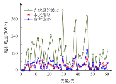 計(jì)算得出光伏原始功率超標(biāo)電量、經(jīng)本文策略以及經(jīng)參考策略平抑后的超標(biāo)電量的平均值分別為:123.27 kW?h/天、31.67 kW?h/天、37.39 kW?h/天。從超標(biāo)電量的均值來(lái)看,本文所提策略和參考策略都能有效地平抑光伏功率波動(dòng),但本文策略超標(biāo)電量的平均值更小,平抑效果更好。