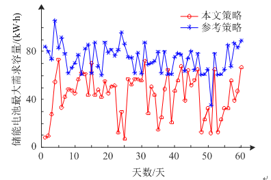 2種策略Eneed的分布情況如圖11所示,從仿真結(jié)果可以直觀地看出本文所提策略對(duì)儲(chǔ)能的容量需求遠(yuǎn)小于參考策略。