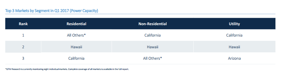 在2017年1季度,用戶側(cè)儲(chǔ)能安裝較2016年4季度降低了22%。同時(shí),住宅用儲(chǔ)能市場(chǎng)發(fā)展相對(duì)平緩,環(huán)比降低了5%。相比之下,非住宅用儲(chǔ)能市場(chǎng)降低了26%,導(dǎo)致大幅下滑的主要原因是萬(wàn)眾期待的下一階段的自發(fā)電激勵(lì)計(jì)劃(Self-Generation Incentive Program)在很大程度上造成了加州非住宅用儲(chǔ)能市場(chǎng)的急劇下降。