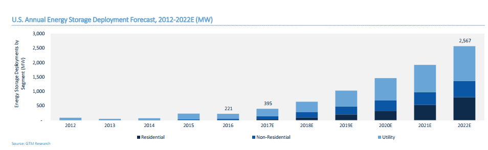 GTM研究所預(yù)測(cè),2022年美國(guó)儲(chǔ)能市場(chǎng)將增長(zhǎng)到2.6GW左右,幾乎是2016年的12倍(221MW)。
