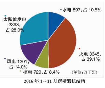 受煤電政策、環(huán)境約束等因素影響,2016年1~11月,全國新增裝機(jī)規(guī)模同比下降了5.4%,為8557萬千瓦。其中,火電新增裝機(jī)同比下降了30%,非化石能源新增裝機(jī)同比增長21%,比重進(jìn)一步提升至60.9%,創(chuàng)下歷史新高。預(yù)計(jì)全年新增裝機(jī)規(guī)模將達(dá)到1.3億千瓦,同比下降1.7%。其中,非化石能源新增裝機(jī)比重為61.1%。期末總裝機(jī)容量達(dá)到16.5億千瓦,同比增長8.5%,非化石能源裝機(jī)比重達(dá)到36.2%,較2015年提高了2.1個(gè)百分點(diǎn)。
