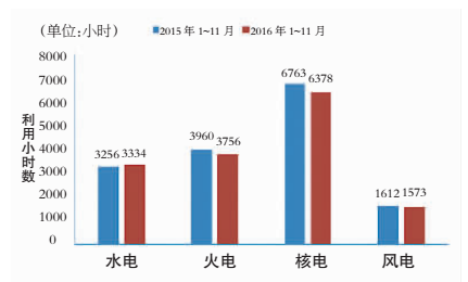 2015年、2016年1~11月各類型電源發(fā)電利用小時(shí)數(shù)對(duì)比