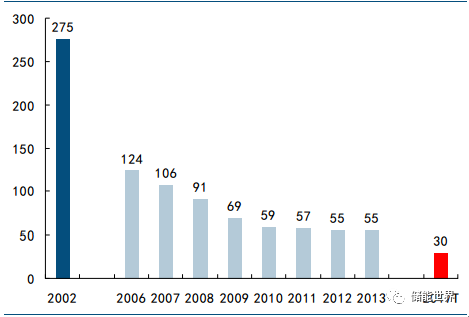 工業(yè)化和商業(yè)化的絕大多數(shù)問題都可以歸結到成本之上,燃料電池亦不例外。近 10 年來,燃料電池的成本控制一直是研究機構和實業(yè)界最重要的目標之一。孜孜不倦的努力也取得了回報,基于 2013 年的技術水平,在年產(chǎn) 50000 套的規(guī)模下,車用 80kW 功率的 PEMFC 燃料電池成本降低到 55 美元/kW(請注意上述各種約束條件?。?,較之 2002 年的 275 美元/kW 下降了 80%,距離 2017 年30 美元/kW 的目標僅數(shù)步之遙(對此需要指明兩點:其一,30 美元/kW 的成本在 2008 年左右還是 2015年計劃實現(xiàn)的目標;其二,2012 年成本估算曾經(jīng)低至 47 美元/kW,但基于更嚴格的熱排放指標和最新的Pt 金屬價格,這一估算在 2013 年被調(diào)高了)。