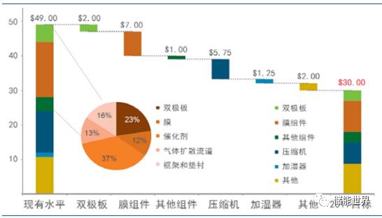 催化劑決定了電池組系成本的主要部分,而對于由電池組及壓縮機、加濕器及其他配件構成的整體燃料電池系統(tǒng)而言,以壓縮機為主的其他組件同樣尚有成本壓縮空間。從 49 美元/kW 到 30 美元/kW 的成本下降預期路徑中,電池組和其他組件成本基本各占一半。最后,在量產(chǎn)假設下的充分攤薄成本構成中,材料以外的成本約占 1/4。燃料電池成本的下行依賴從基礎科學到工程優(yōu)化的系統(tǒng)努力,任重道遠。