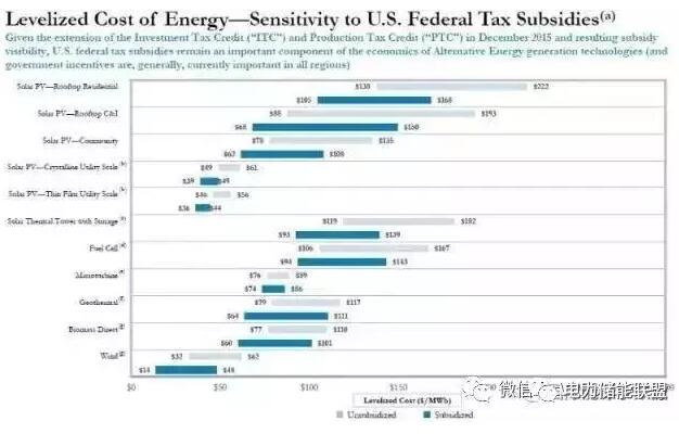 如果考慮聯(lián)邦稅收優(yōu)惠,那么各類替代能源的全生命周期平準(zhǔn)成本下降幅度可達(dá)30%: